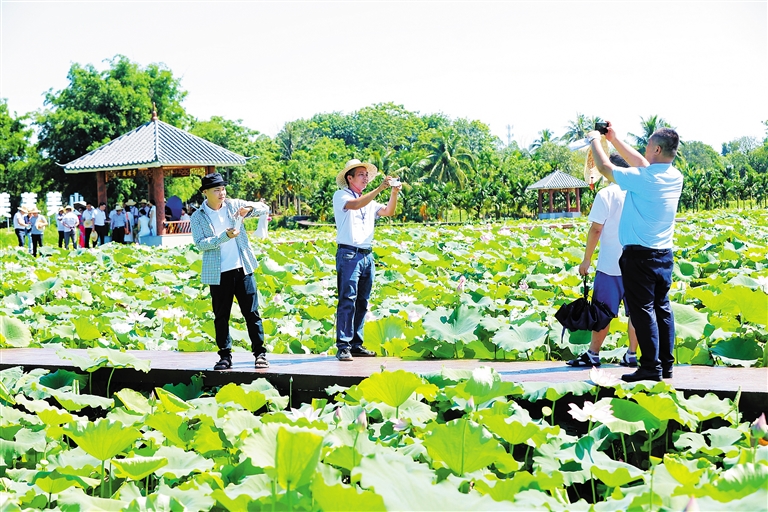 6月21日,在临高县多文镇美山村首届莲花文化节开幕式上,美山村党支部书记王德介绍,美山莲花产业种植基地项目在2022年引进海南金海云贵农业开发有限公司共同开发的新项目,以创建千亩“美莲产业示范基地”为目标。目前,莲田种植基地500多亩,每亩产量水果莲800斤左右,每亩莲花有5000至6000朵,并设立莲文化长廊供游客休息、玩赏。
