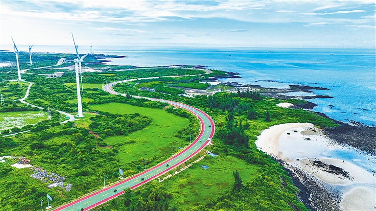 近日,俯瞰海南环岛旅游公路儋州段,蓝色海水与绿色林木相映,景色十分优美。