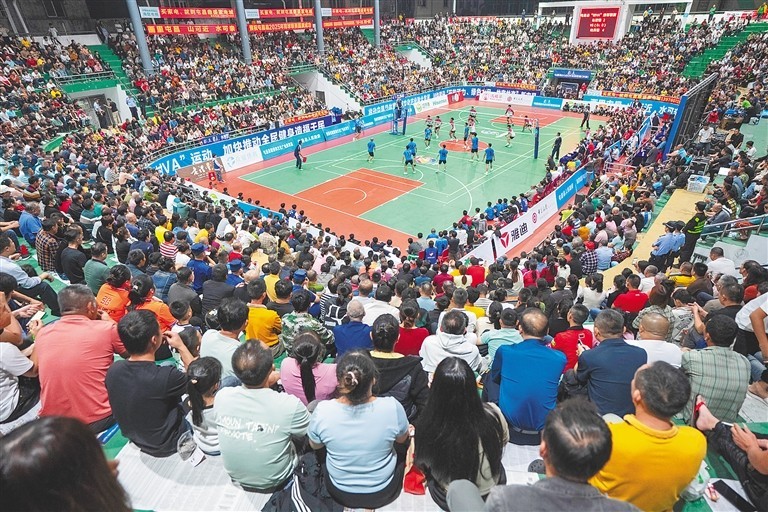 这场“村VA”村味十足。场上主力队员既有在校学生,也有种植户、养殖户等各行各业人员,他们在扣杀与轻巧吊球间随意切换,让人眼花缭乱。观众席上,群众体育的激情与活力满满,除了青年小伙,还有早早入场等候的耄耋老者、带娃的农妇等,大家纷纷为选手呐喊加油。
