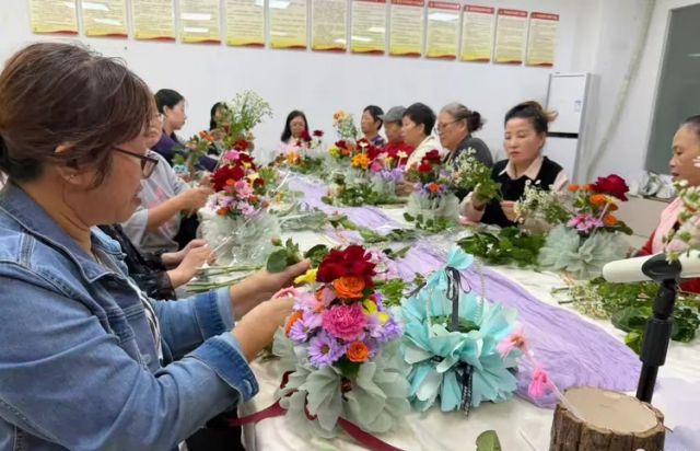 随后,长者们兴致勃勃地动手实践,有的仔细挑选心仪的花材,有的认真修剪枝叶,不时与身边同伴交流创作心得。社区工作人员则在一旁耐心协助,帮行动不便的长者递工具、调整花束。整个活动室里花香四溢,满是欢声笑语。