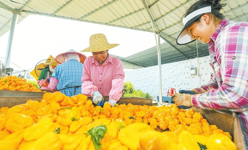 龙华区遵谭镇龙合村黄灯笼辣椒种植基地,农户在分拣黄灯笼辣椒。本报记者 康登淋 摄