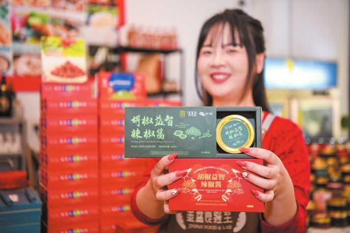 在金盘食验室,工作人员展示经过加工后的胡椒益智辣椒酱。本报记者 苏弼坤 摄