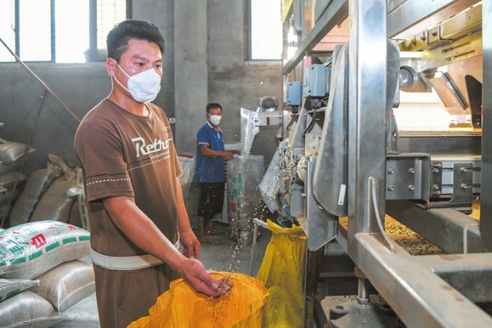 在大坡镇,海南杨元广胡椒贸易有限公司工作人员正仔细查看筛选后的胡椒颗粒。本报记者 苏弼坤 摄