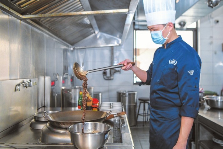在金盘食验室的后厨,工作人员正在加工胡椒益智辣椒酱。本报记者 苏弼坤 摄