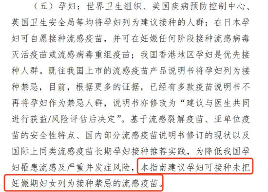 因此,为降低我国孕妇罹患流感及严重并发症风险,指南建议孕妇可接种未把妊娠期妇女列为接种禁忌的流感疫苗。
