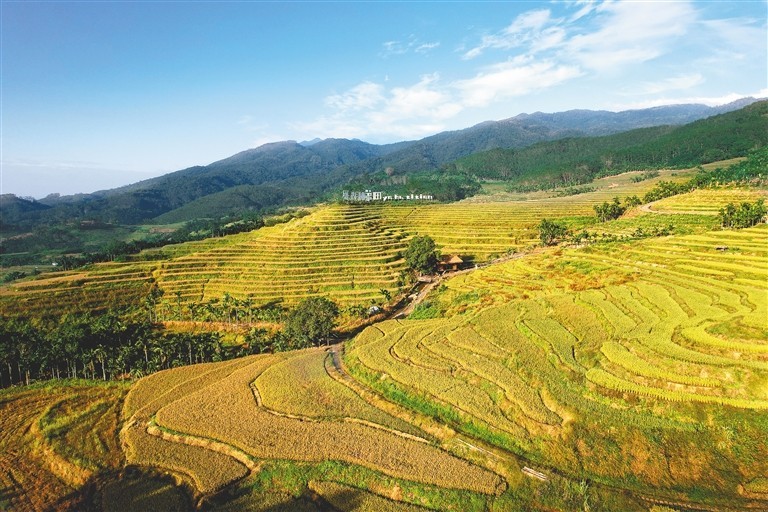 近日,五指山市牙胡梯田景区核心区1400多亩稻田进入成熟期。11月15日,五指山市毛阳镇2025年晚造开镰活动在该景区启幕,当天吸引了500余名游客齐聚梯田,共赏金色稻浪。