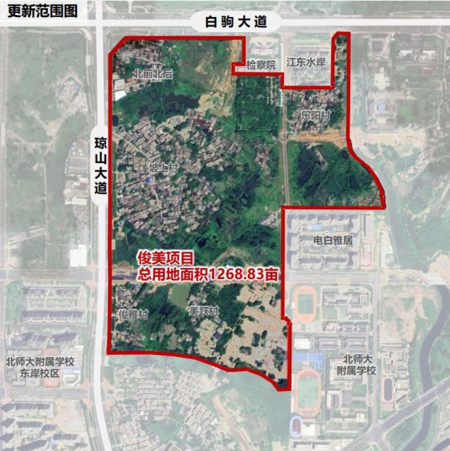 该项目位于海口江东新区国际综合服务组团(美兰区灵山镇),地处白驹大道与琼山大道交叉口东南侧,更新范围总面积84.59公顷(约1268.83亩)。具体四至为:东至北师大附中、电白雅居及规划水系,南至规划水系,西至琼山大道,北至白驹大道。项目更新区域覆盖灵山镇下辖的5个行政村,涉及房屋建筑面积约19.56万平方米,约700户、2000人。
