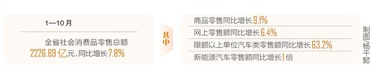 促消费措施成效明显,汽车类消费高速增长。居民消费向“绿色、智能、品质”焕新转型,以旧换新政策加速升级浪潮,新能源汽车成为拉动增长的引擎。1—10月全省限额以上单位汽车类零售额同比增长63.2%,新能源汽车零售额同比增长1倍。