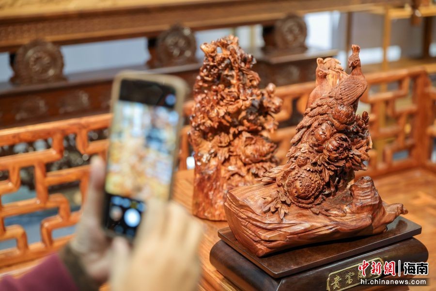 图为参观者用手机拍摄展出的海南黄花梨工艺品。骆云飞 摄