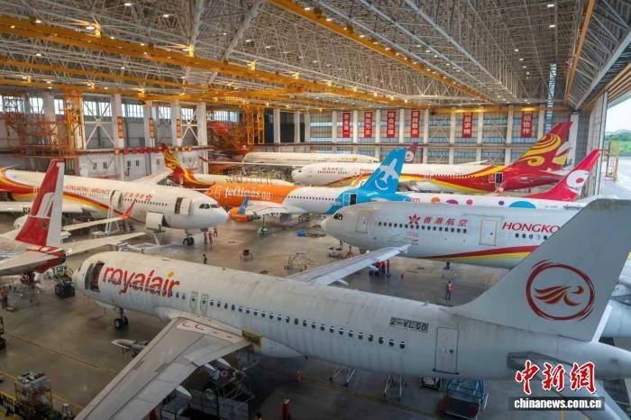 海南自贸港一站式飞机维修产业基地一片繁忙景象。 (海航航空集团有限公司 供图)
