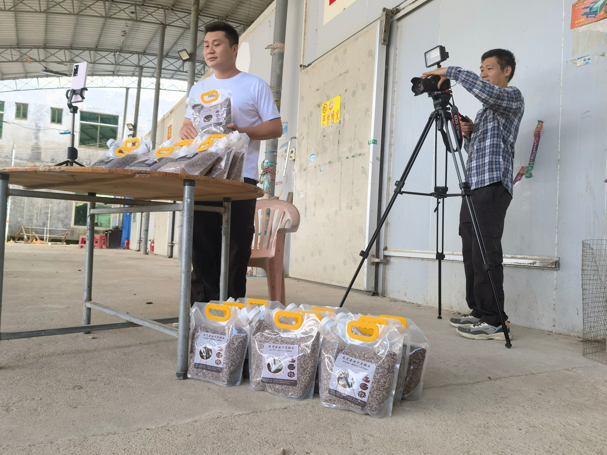 在武山村黑糯米仓库,一场热火的助农直播正在实时进行。村“两委”干部化身“本土带货主播”,对着手机镜头详细推介黑糯米的品种优势、种植环境与食用价值;镜头之外,工作人员分工明确,快速完成贴标签、打包等流程,仓库内外呈现出“直播接单忙、发货不停歇”的繁忙景象。