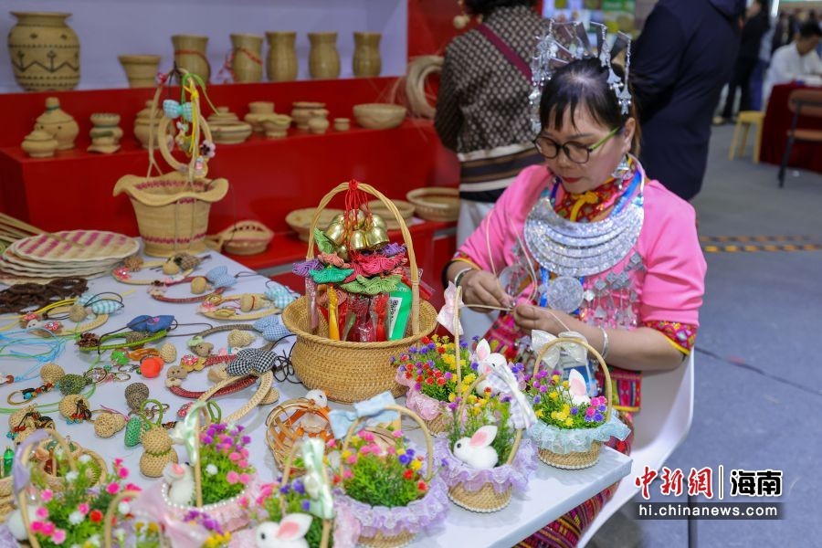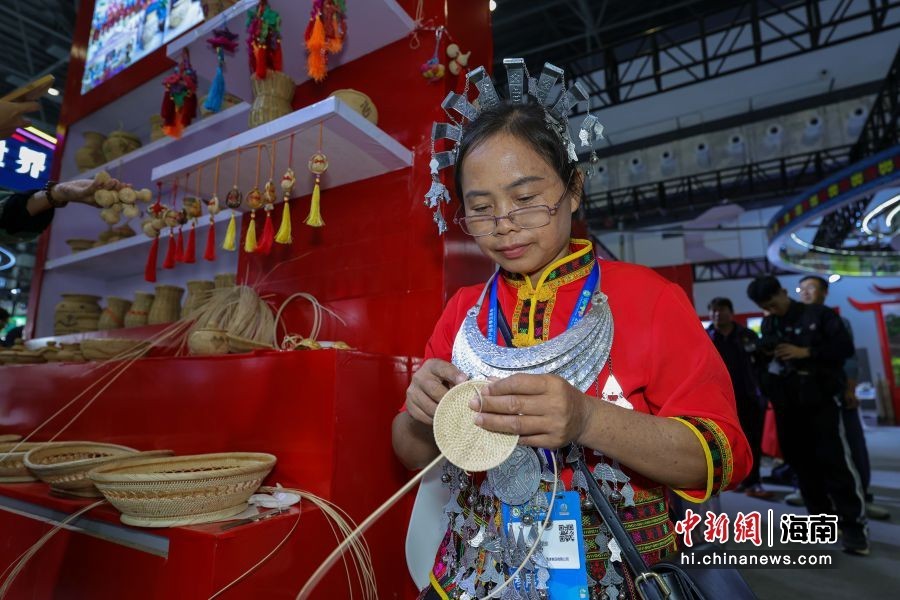 图为身着黎族传统服饰的阿姐展示竹编技艺。骆云飞 摄