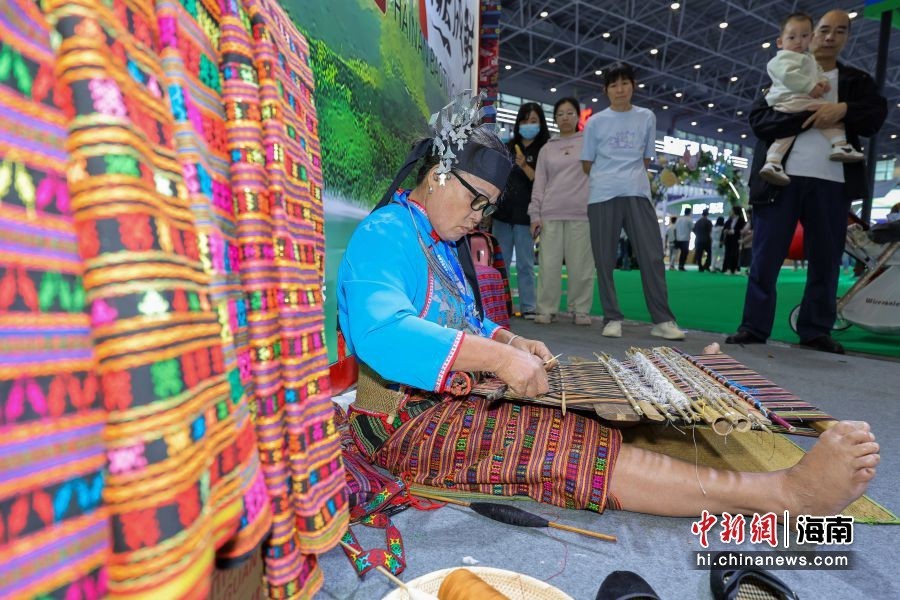 图为一位阿婆现在展示黎锦技艺吸引参观者。骆云飞 摄