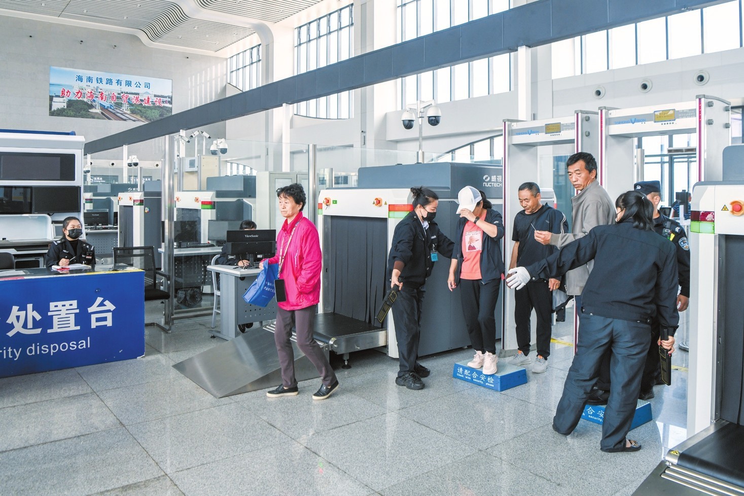 当天上午,旅客在现场工作人员的指引下,快速顺畅地通过安检,顺利登船。