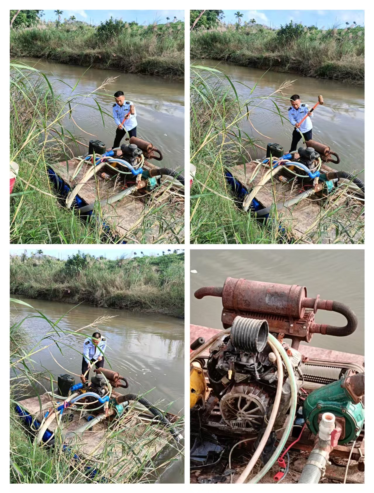 根据举报线索,执法人员前往礼纪镇太阳村委会老黄村河道进行排查。经查,现场发现一处非法采砂点,并遗留有一部采砂机器和抽砂管道,未发现作业人员。为防止该设备被再次用于非法作业、继续破坏河道环境,执法人员对该机器和管道进行捣毁。