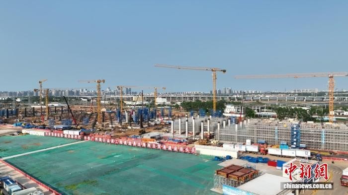 据项目负责人王春林介绍,从一片泥泞鱼塘到全面竣工,项目有效工期仅有420天。这意味着在2.4公里长的狭长地带上,土建、钢结构、幕墙、机电、消防等数十个专业工种必须同步展开、交叉作业、无缝衔接。叠加海南地区高温、多雨、台风频繁的恶劣气候,项目必须保持“全天候、高强度”的施工节奏,且平均每月需达到近1.2亿元的产值强度,每一步都是“极限冲刺”。