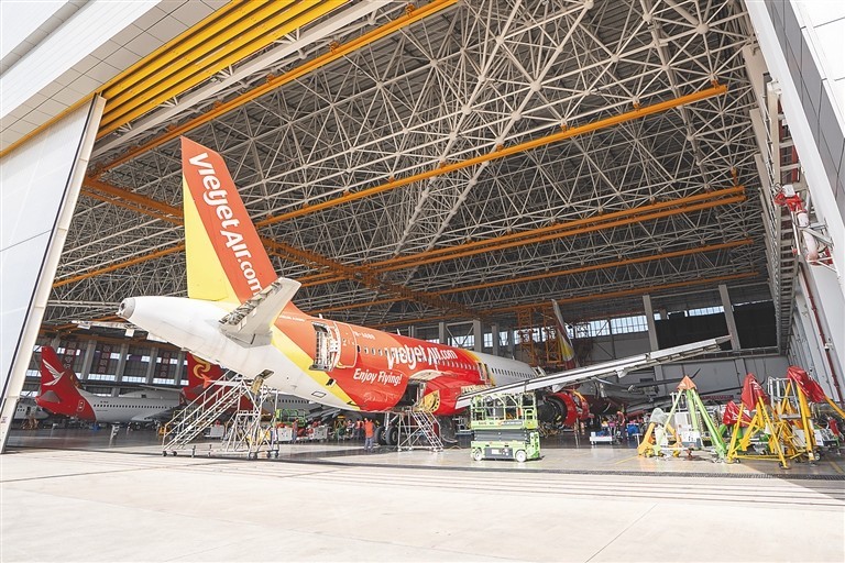 在位于海口的一站式飞机维修产业基地内,维修人员对进境飞机进行检修。新华社记者 张丽芸 摄