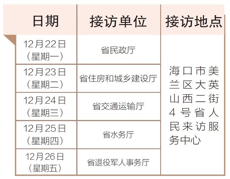 12月22日至26日,省民政厅、省住房和城乡建设厅、省交通运输厅、省水务厅、省退役军人事务厅相关负责人将在海口市美兰区大英山西二街4号省人民来访服务中心接访群众。