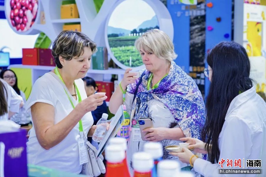 海垦展馆围绕“海垦品质·全球共享”理念,融合生态元素与科技手段,设置精品展销、互动体验、商务洽谈三大功能区。展销区内,有机杂粮、母山咖啡、热带果蔬等特色农产品琳琅满目,吸引大量参观者驻足;互动区提供免费试吃,不少游客品尝后直接下单。