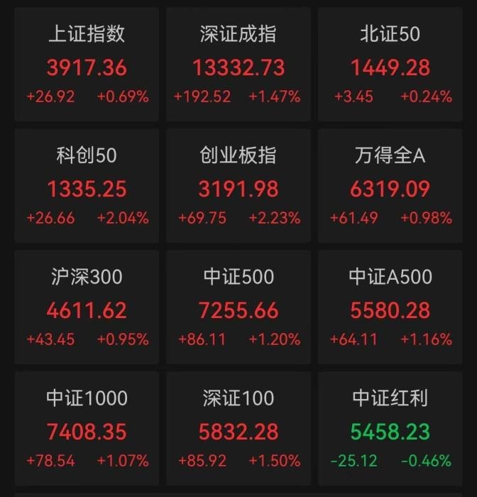截至收盘,沪指涨0.69%报3917.36点,重回3900点上方;深成指涨1.47%报13332.73点;创业板指涨2.23%报3191.98点。市场全天成交额约1.88万亿元,较前一交易日有所放量。
