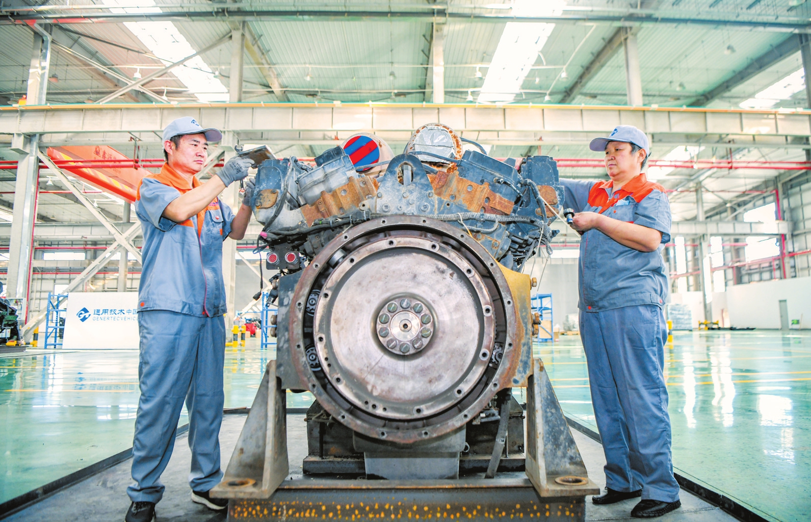 12月22日,在海口综合保税区中车国际车辆产业(海南)有限公司,工作人员正在对一批发动机开展保税维修作业。