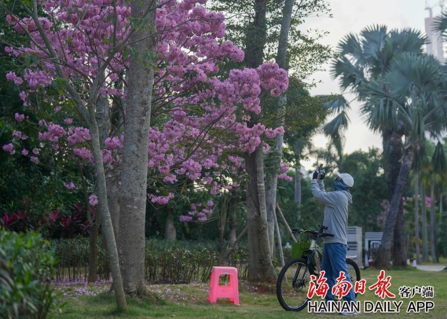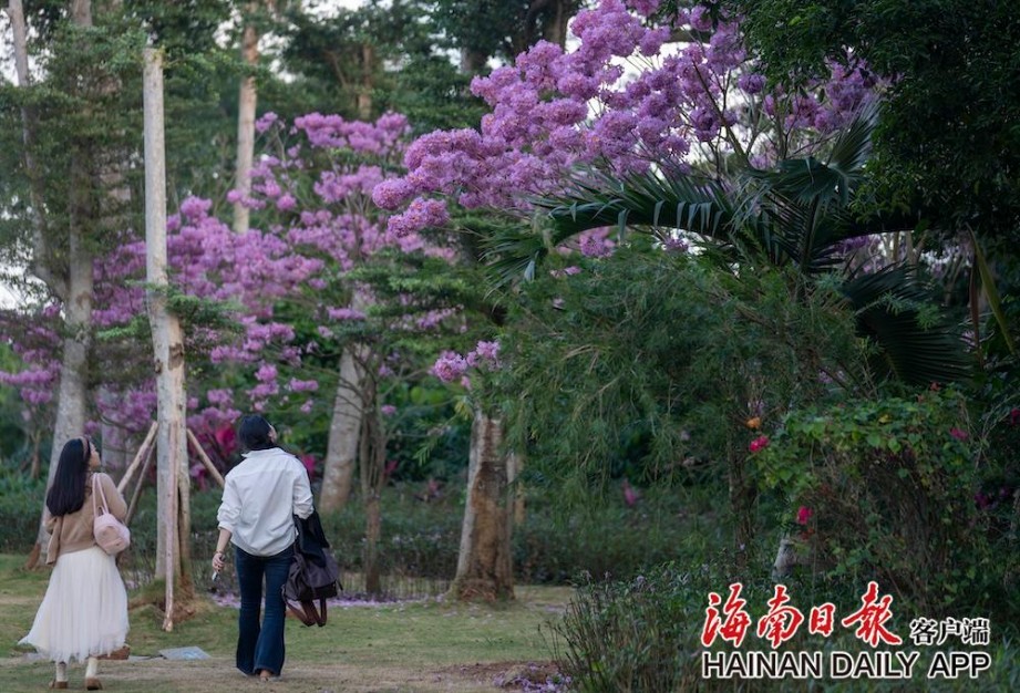 12月23日,在海口国兴大道上,市民游客观赏紫花风铃木的花朵。海南日报全媒体记者 李天平 摄