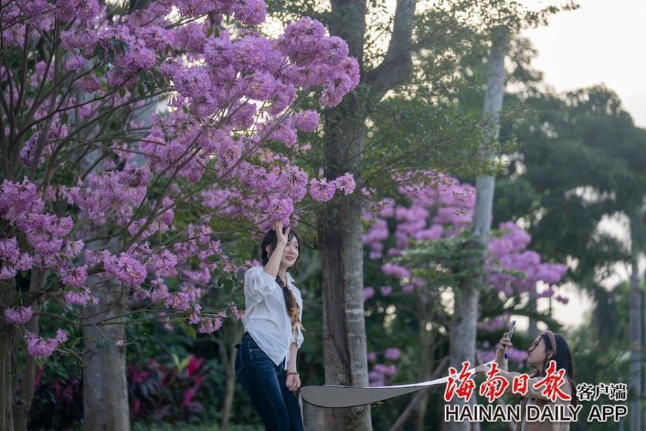 12月23日,海口国兴大道上的紫花风铃木满树繁花,吸引市民游客前来拍照留念。海南日报全媒体记者 李天平 摄
