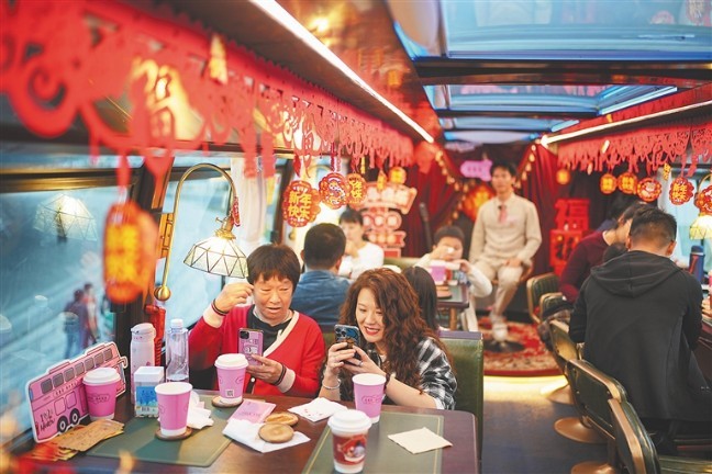 游客坐在老爸茶海口巴士上品尝美食,欣赏沿途美景。海南日报全媒体记者 张茂 摄