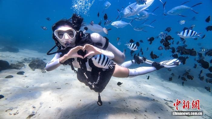 图为游客在三亚蜈支洲岛旅游区潜水。 (三亚蜈支洲岛旅游区 供图)