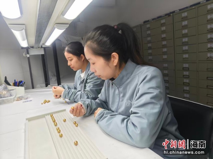 1月9日,海南京润珍珠科技股份有限公司生产车间内,质检人员将一批从印尼进口的金珠进行分级。 (海南京润珍珠科技股份有限公司 供图)