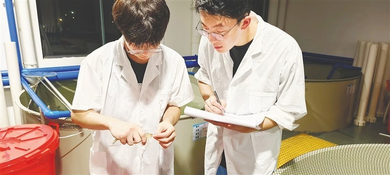 技术人员测量虾体长、取样测虾基因、编号登记。受访企业供图