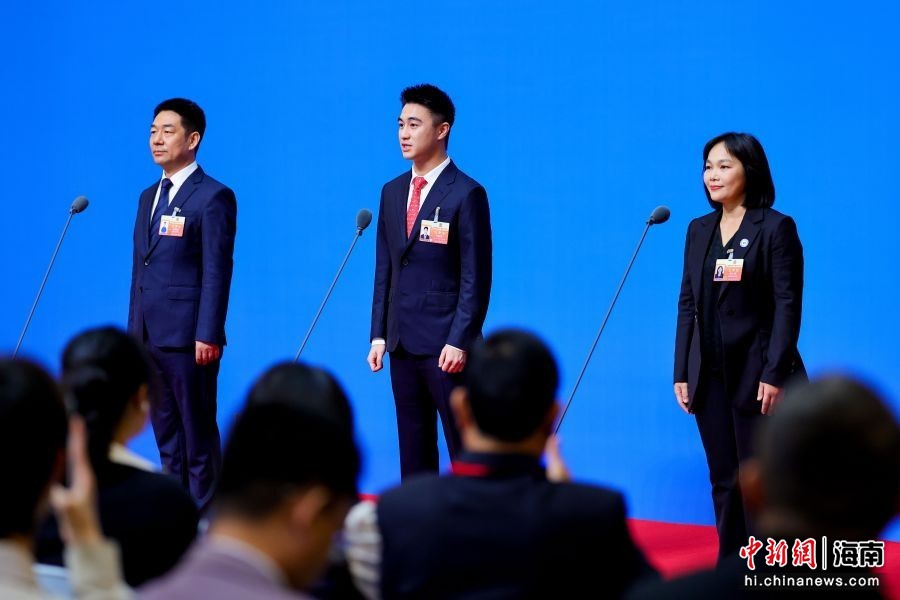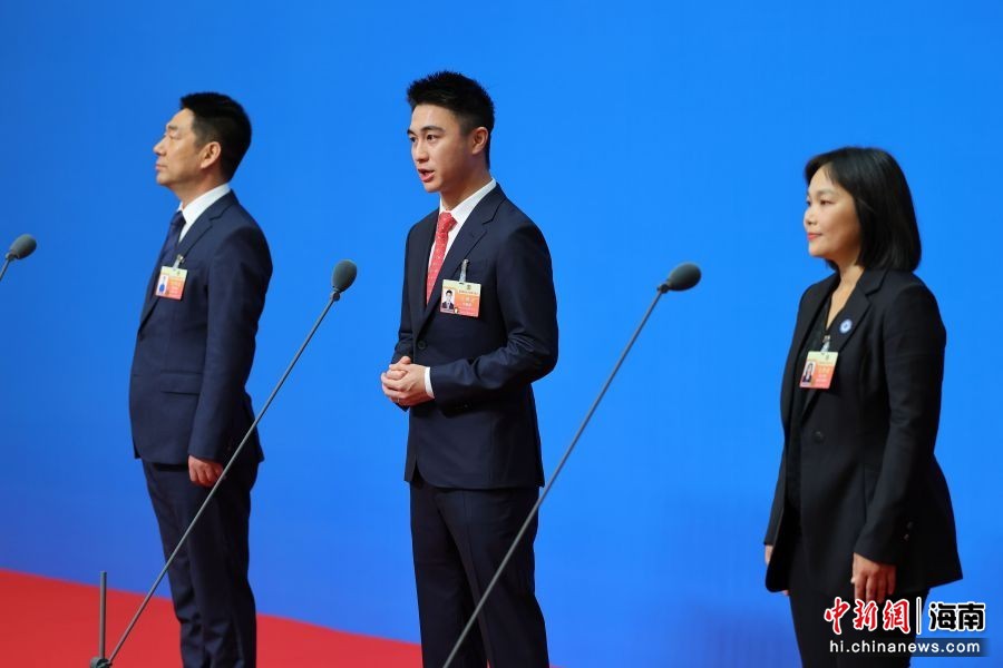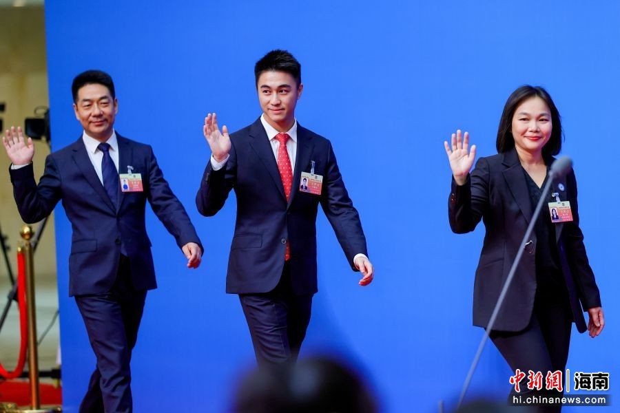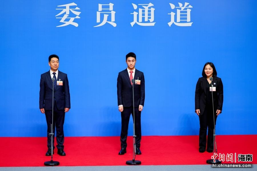 图为科大讯飞海南声谷科技有限公司董事长张树彬;星竞威武集团董事长兼首席执行官,NBA波士顿凯尔特人队共同所有人何猷君(中);民进省委会副主委,海南省侨联副主席,海南软件职业技术学院院长韩小雨(右)亮相“委员通道”。骆云飞 摄