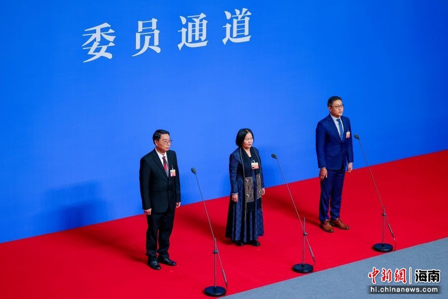 图为中国热带农业科学院椰子研究所研究员,椰子研究中心主任杨耀东;海南省政协文化文史和学习委员会副主任,省文联副主席,省民协主席,海南大学研究员蔡葩(中);毕马威企业咨询(中国)有限公司高级合伙人,海南省党外知识分子联谊会副会长高人伯(右)亮相“委员通道”。骆云飞 摄