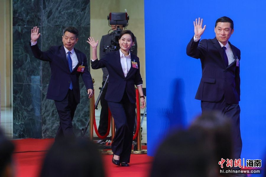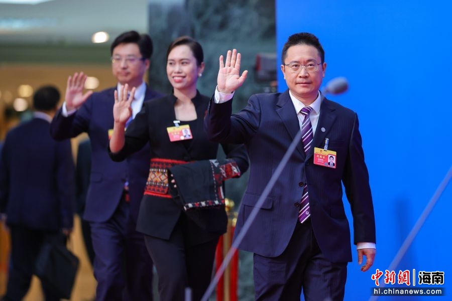 图为海南博鳌乐城国际医疗旅游先行区管理局局长傅晟(左);昌江黎族自治县黎之韵织锦专业合作社社长,海南黎之韵文化传播有限公司党支部书记、总经理,县农村青年致富带头人协会会长唐丽金(中);中核集团(海南)市场开发部主任,海南核电有限公司党委书记、董事长魏智刚亮相“代表通道”。骆云飞 摄