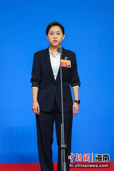 图为海南省人大代表,海南自贸港金融学会副秘书长,三亚学院盛宝金融科技商学院副院长(主持工作)陈晓昕亮相“代表通道”并回答记者提问。骆云飞 摄