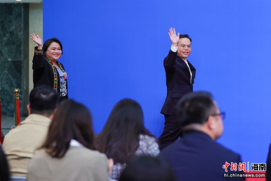 图为海南自贸港金融学会副秘书长,三亚学院盛宝金融科技商学院副院长(主持工作)陈晓昕(左);海南现代科技集团有限公司执行总裁,文昌航天超算智慧科技有限公司董事长叶世阳亮相“代表通道”。骆云飞 摄