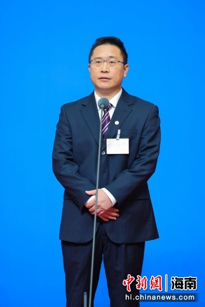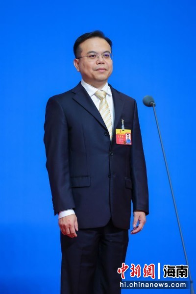 图为海南省人大代表,海南现代科技集团有限公司执行总裁,文昌航天超算智慧科技有限公司董事长叶世阳亮相“代表通道”并回答记者提问。骆云飞 摄