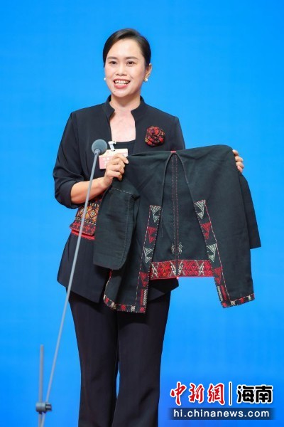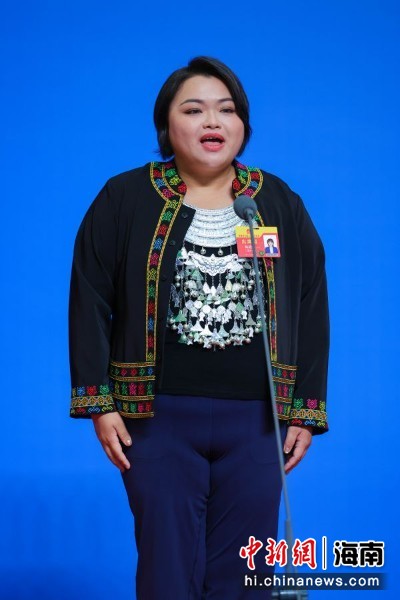 图为海南省人大代表,昌江黎族自治县黎之韵织锦专业合作社社长,海南黎之韵文化传播有限公司党支部书记、总经理,县农村青年致富带头人协会会长唐丽金亮相“代表通道”并回答记者提问。骆云飞 摄