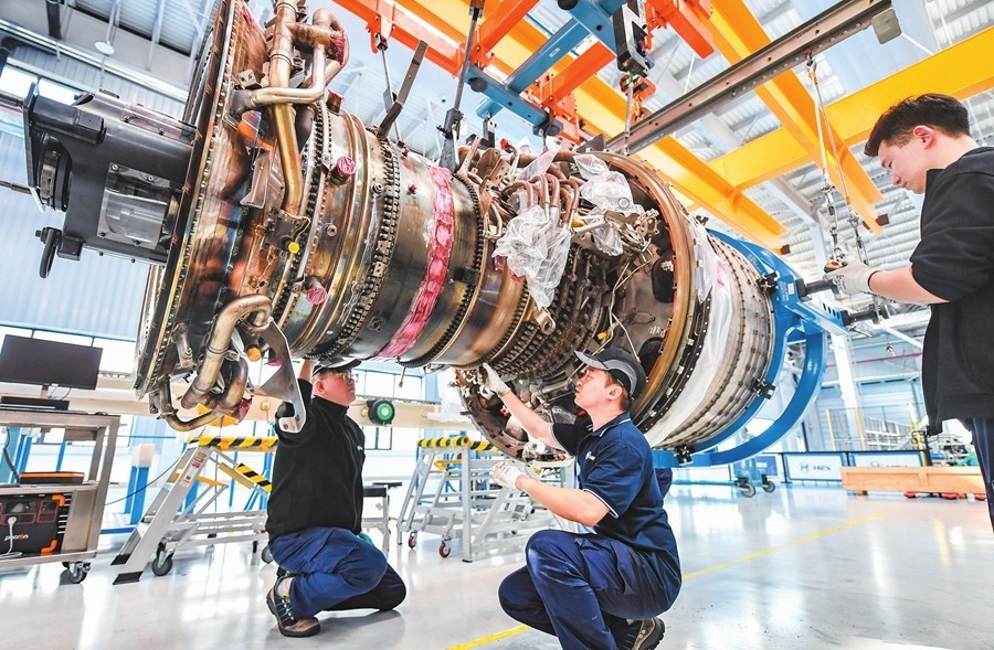 位于海口空港综合保税区的吉耐斯航空发动机维修工程有限公司车间内,工作人员对航空发动机进行检修。本报记者 苏弼坤 实习生 陈新锐 摄