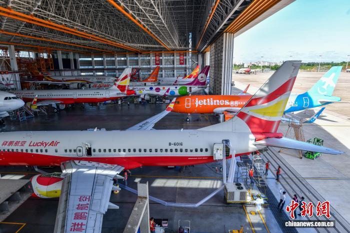 2025年6月19日,海南海口,在海南自贸港一站式飞机维修产业基地,工程师们化身“飞机医生”,正为多家进境维修飞机提供全面检修服务。中新网记者骆云飞摄