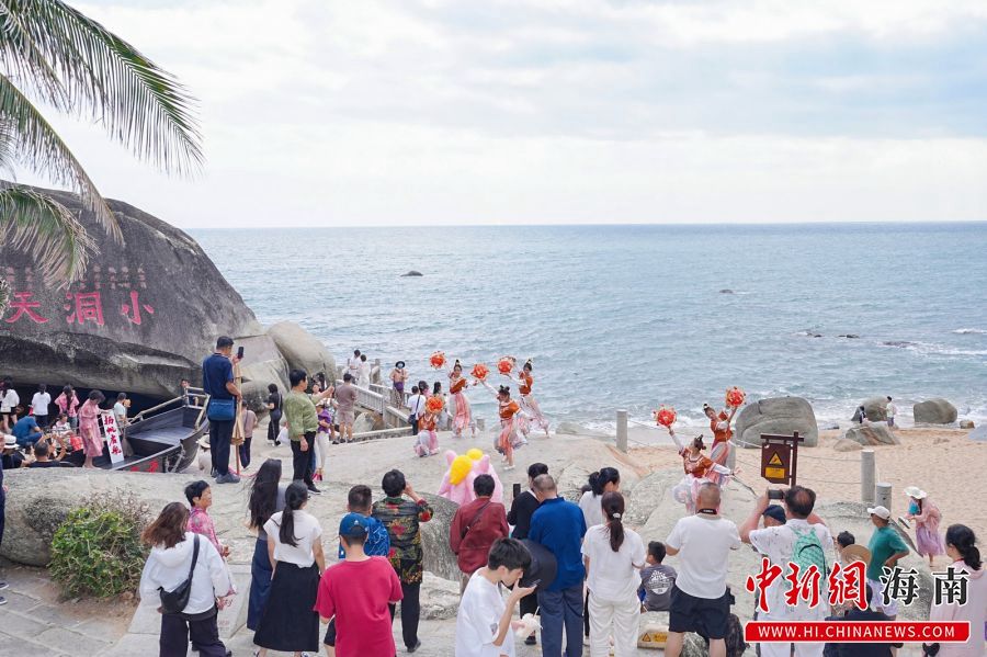 2月18日,三亚大小洞天旅游区正在举行“马踏春潮·龙跃洞天”新春游园会。图为演艺活动吸引游客观赏。(三亚大小洞天旅游区 供图)