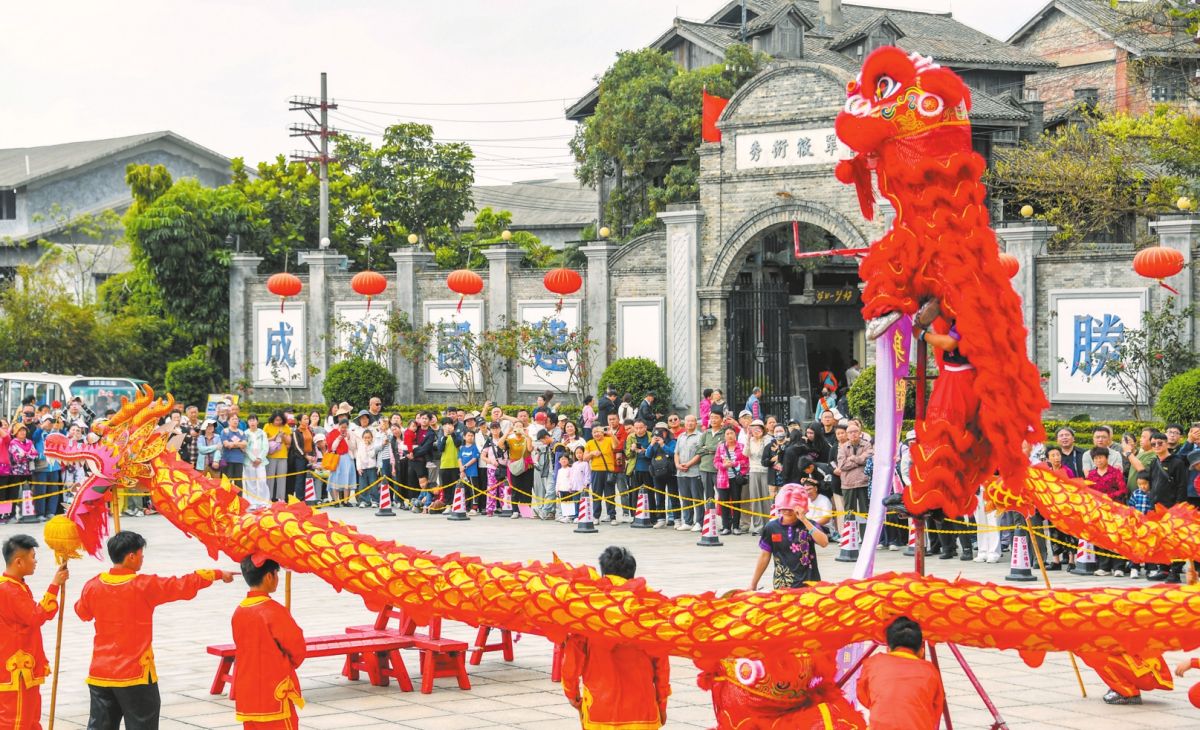 2月19日,在观澜湖华谊冯小刚电影公社,精彩的舞龙舞狮表演吸引市民游客驻足观赏。本报记者 康登淋 摄