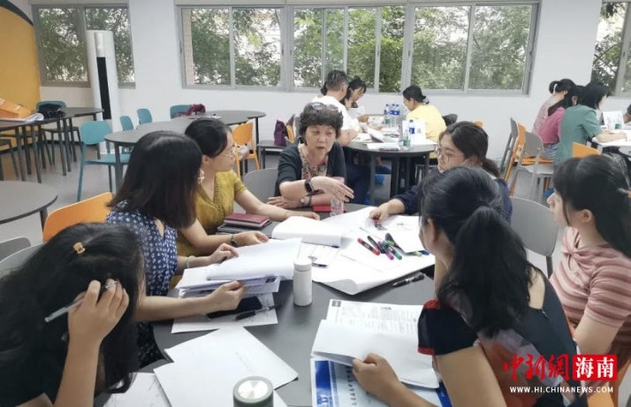 图为团队成员在北京师范大学外国语言文学学院教授王蔷指导下研讨英语教学。 陈琦 摄
