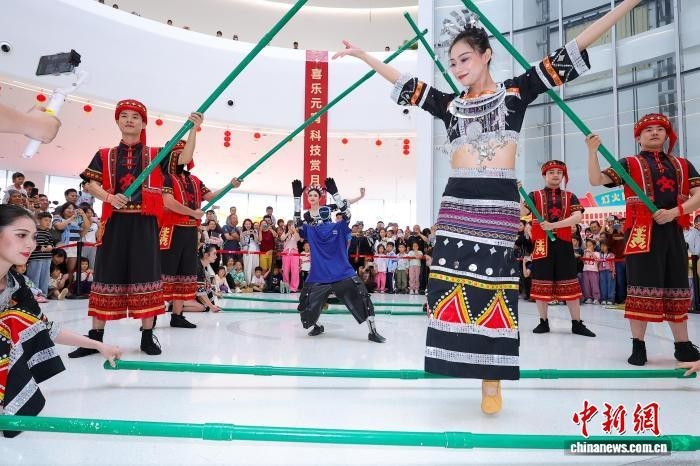 3月3日农历正月十五元宵节,一场“竹竿舞人机共舞”快闪活动在海南科技馆上演。中新网记者 骆云飞 摄