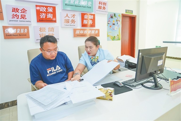 在屯昌县政务服务中心“肩并肩”开放式窗口,工作人员在为企业办理业务。海南日报全媒体记者 李天平 摄