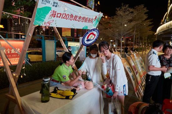 海口市120急救志愿服务队作为公益夜市的常客已经被市民们所熟悉,之前参与过急救培训的刘先生主动上前演示心肺复苏的操作步骤,熟练的动作和严谨认真的态度收获了现场市民们的一致好评,市民们学习的热情也被带动起来,志愿者趁热打铁,带领市民们共同学习AED的使用、气道异物梗阻解救术等急救知识,抓住每一个细节,力争让市民们准确掌握。现场还设置急救答疑环节,志愿者针对市民们日常遇到的摔伤、烫伤等问题给予专业解答。