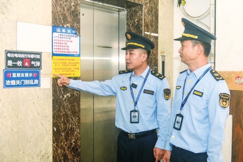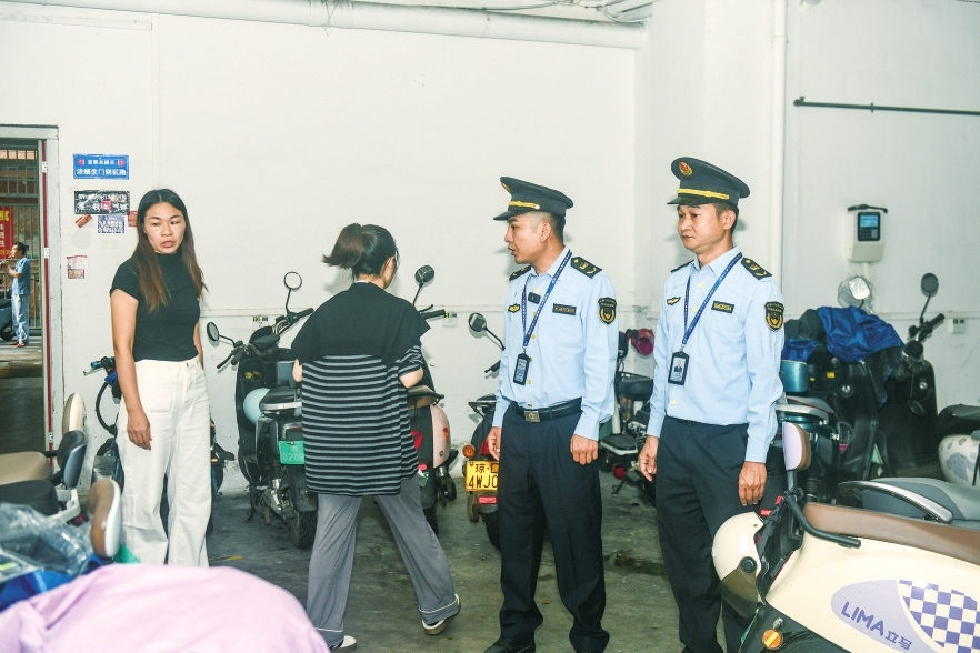 执法人员在开心青年公寓开展电动车安全隐患排查。 李鑫 摄