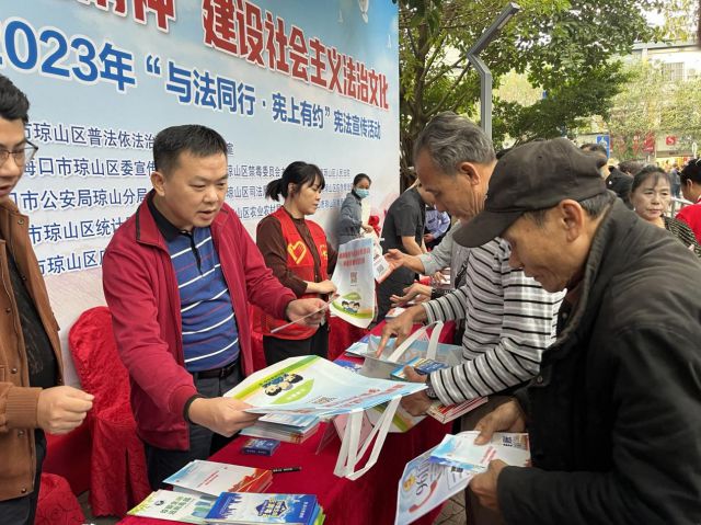 12月4日上午,海口琼山区举办2023年“与法同行·宪上有约”集中宣传活动。进一步增强群众法治意识,引导居民群众学法、懂法、用法,运用法律武器维护自身合法权益,让居民群众获得实实在在的安全感、幸福感,创造和谐文明的社会氛围。