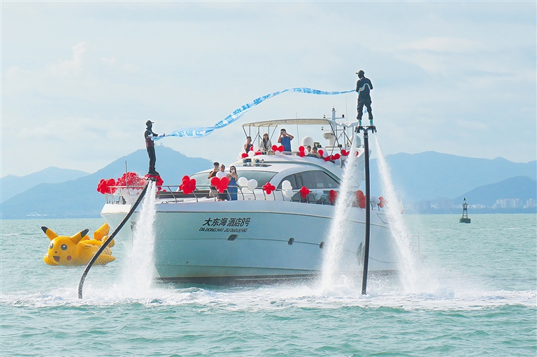 国庆中秋假期,游客在三亚湾海域乘坐游艇,体验水上娱乐项目。 海南日报全媒体记者 王程龙 摄
