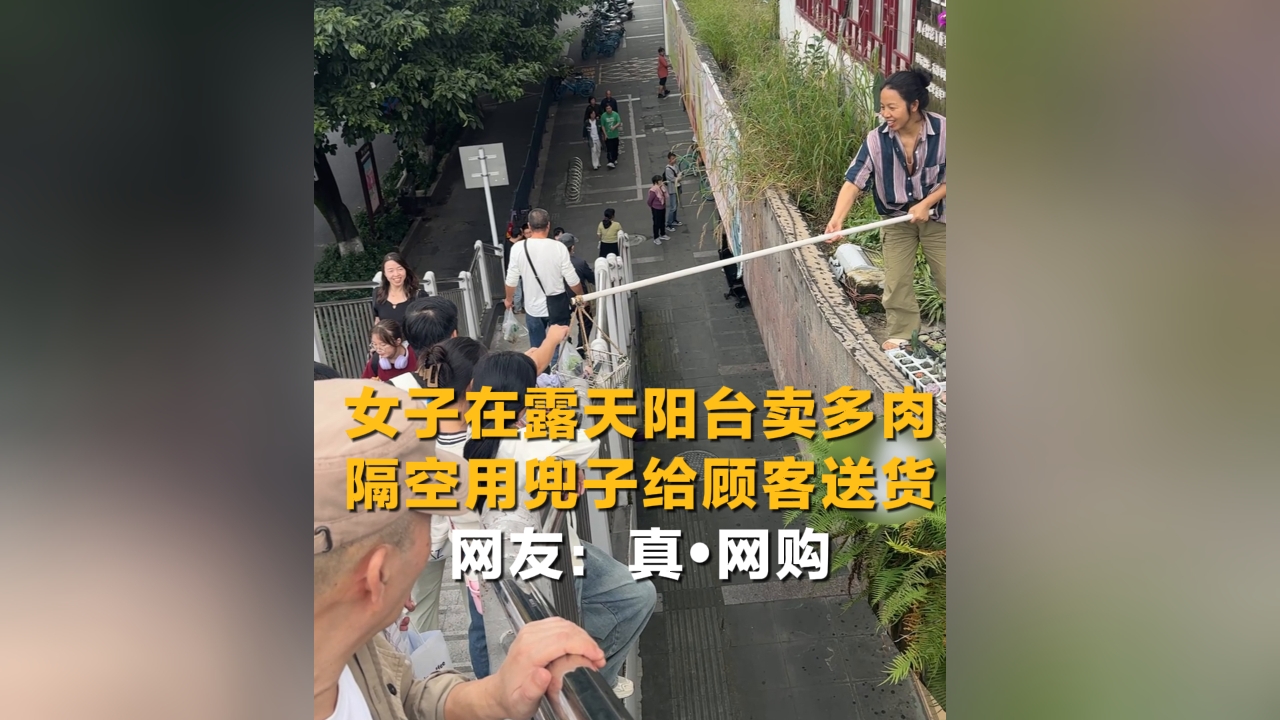 女子在露天阳台卖多肉 隔空用兜子给顾客送货